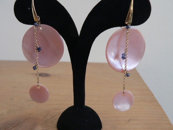Orecchini pendenti in oro giallo con chiusura ad amo realizzata con madreperla rosa di diverse grandezze e piccole sferette schiacciate e di zaffiri naturali sfaccettati